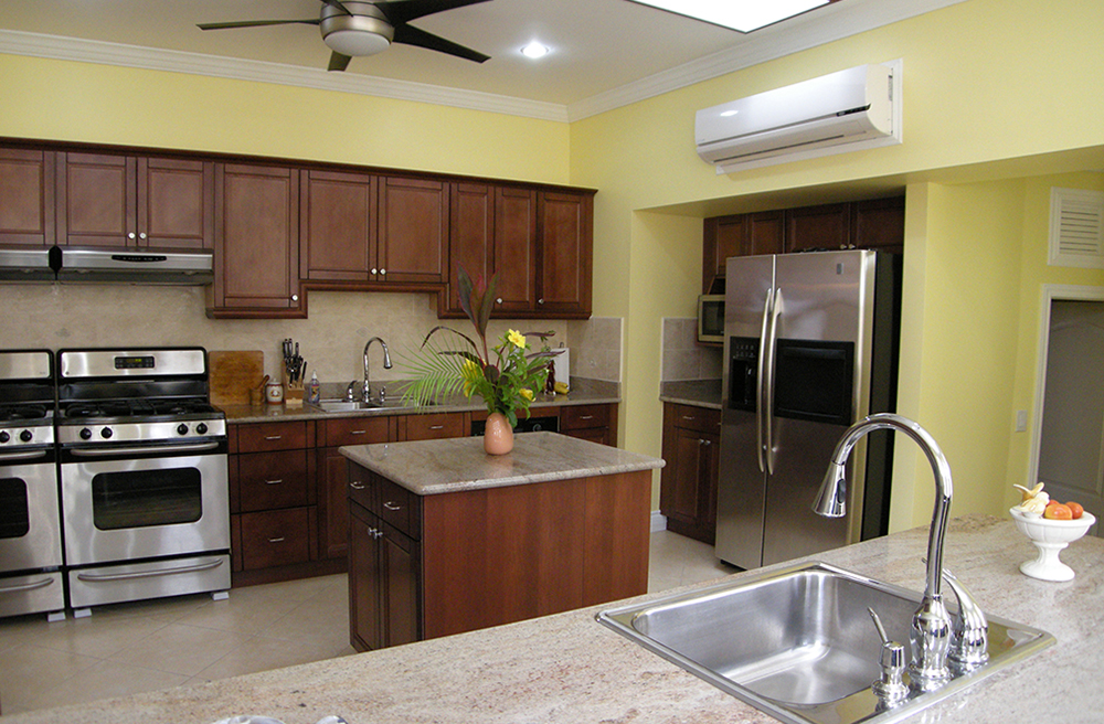 - Kitchen features Mills Pride cabinets, an island, granite counter-tops, 2 large sinks, 2 GE Eterna Series gas ranges (propane) with Allure NuTone extraction fans, GE Profile dishwasher, GE Profile 23 cu.ft. side by side refrigerator/freezer with in-door filtered cold water and ice feature, microwave, 2 Hampton Bay ceiling fans, 2 motorized Andersen Skylights with rain sensors, and pot lights